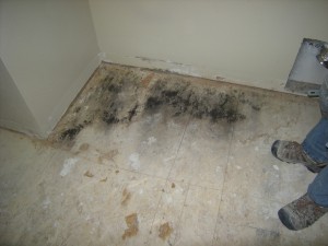 We were recently referred by an insurance agent to a client who was having her laundry room flooring replaced with tile. When the contractor removed the vinyl, there were all sorts of black colored mold that had disintegrated the particleboard underlayment and left visible stains on the OSB subfloor. Within a few minutes, it became obvious that the leak was resolved long ago and the moisture was gone as well. The dust like material was easily vacuumed up with a HEPA vacuum and then the area was scrubbed with a soap and water solution. Finally, the entire area was soaked with a strong antibacterial solution and allowed to dry prior to having the new plastic underlayment applied and tile set.